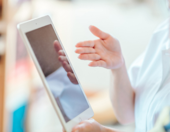 モニターのほかにもタブレット端末を使用し、視覚的に分かりやすい説明を提供しています。